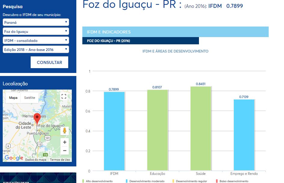 Foz do Iguaçu aparece com pontuação acima de 8 em Educação (0,8107) e em Saúde (0,8451), mas a dimensão Emprego e Renda está abaixo de 8 (0,739). Com isso, Foz ficou com a média de 0,7899 e entrou na lista dos municípios de desenvolvimento médio.