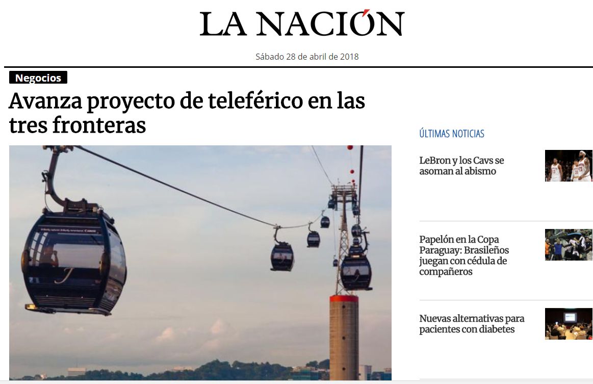 O jornal paraguaio La Nación, de Assunção, traz na edição deste sábado (no impresso e on line) matéria sobre o plano de instalar um teleférico entre Foz do Iguaçu, Ciudad del Este e Puerto Iguazú.
