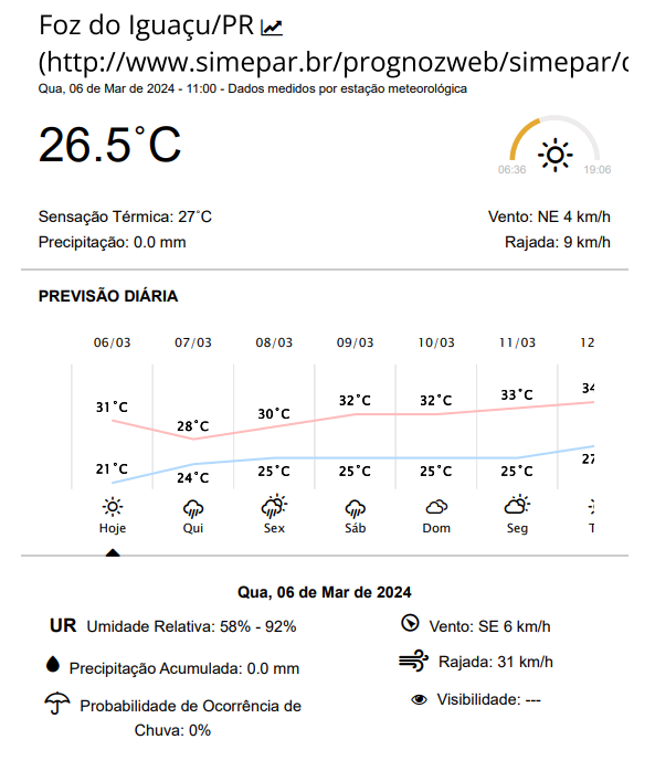 Quarta-feira (06) de céu predominantemente ensolarado em Foz do Iguaçu, mas com 46% de probabilidade de pancadas de chuva e raios. A máxima chega a 32 graus.