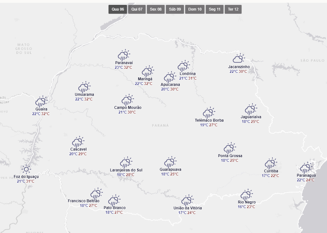 Gráfico do Simepar mostra a previsão do tempo em todo o Paraná, nesta quarta-feira (06)