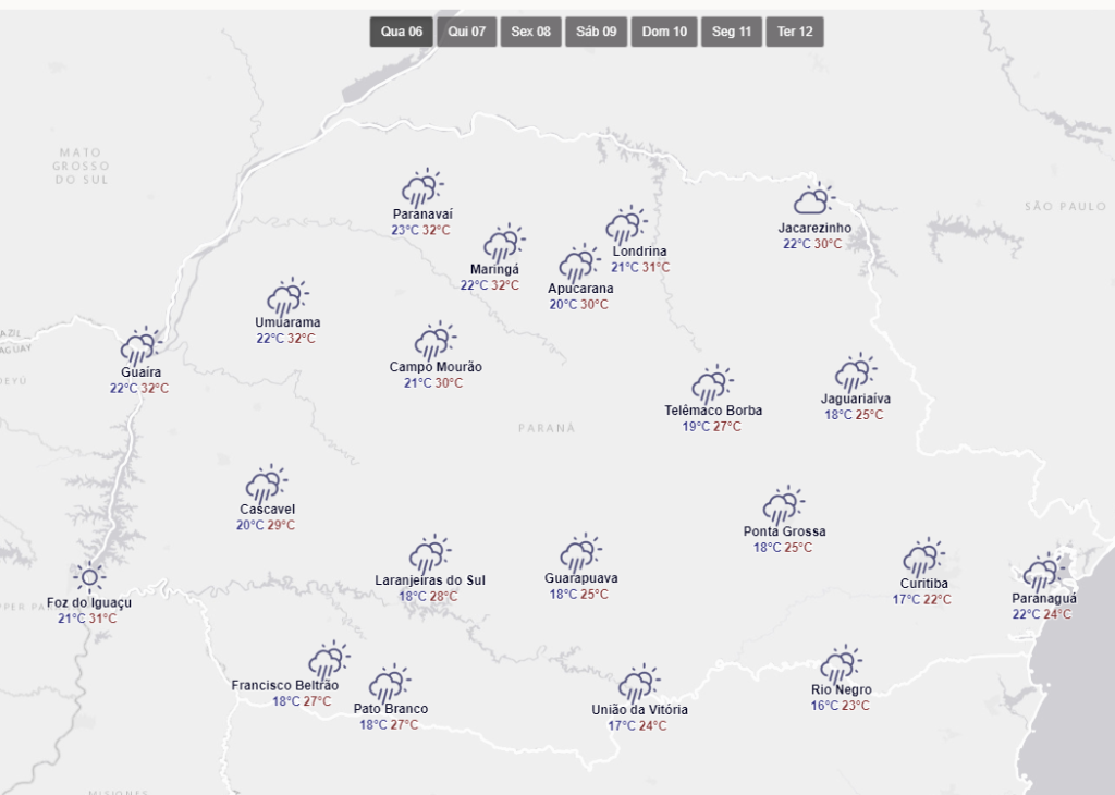 Porém, o Simepar prevê a possibilidade de 98% de chuvas até sábado no município, com temperaturas máximas na casa dos 30 graus.