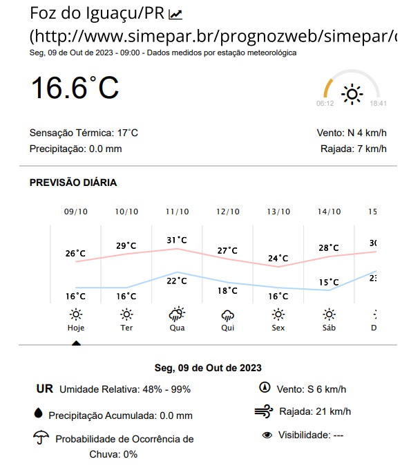 Segunda-feira (08) ensolarada em Foz do Iguaçu, com máxima de 26 graus, sem previsão de chuva.