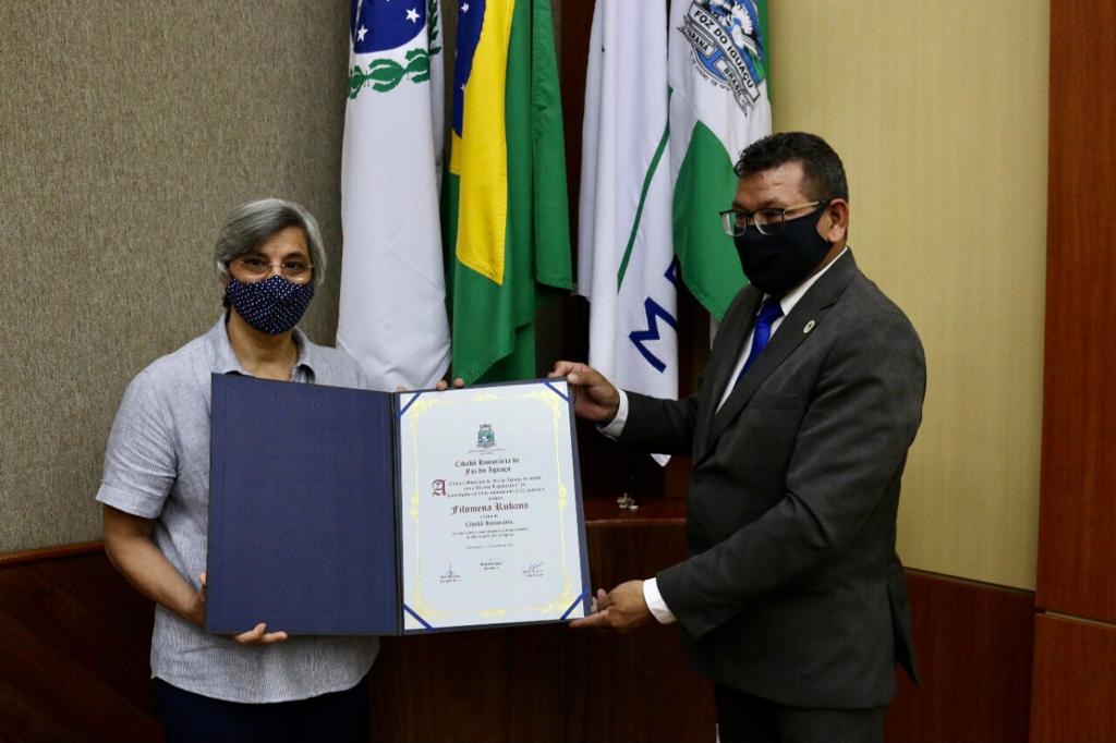 O Legislativo de Foz do Iguaçu entregou em sessão solene privativa, nesta segunda-feira, 14 de dezembro, o Título de Cidadã Honorária de Foz do Iguaçu à irmã Filomena Rubano, em reconhecimento aos serviços prestados ao município, em seu trabalho na AFA (Associação Fraternidade Aliança), com comunidades mais necessitadas.