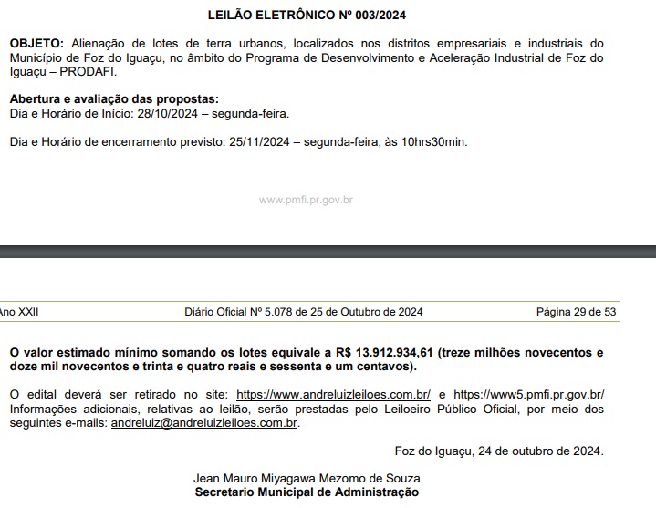 Foi aberto ontem, 28 de outubro, pela Prefeitura de Foz do Iguaçu um leilão eletrônico de 36 lotes localizados nos Distritos Industriais Parque Morumbi 1, Portal da Foz, Pilar Campestre e Minidistrito Industrial do Jardim Europa.