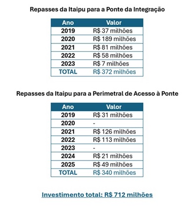 O investimento total da Itaipu para construir a ponte foi de R$ 372 milhões, dos quais 98% ((R$ 365 milhões) foram liberados na gestão do ex-presidente Jair Bolsonaro