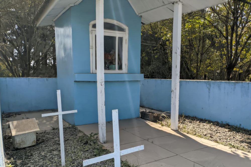 Além das cruzes em metal branco, também há um espaço para velas e um altar com imagens de Nossa Senhora Aparecida.