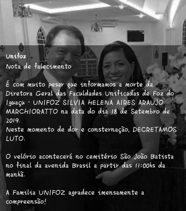 Morreu aos 57 anos, na madrugada desta quarta-feira (18), Silvia Helena Aires Araújo Marchioratto, diretora-geral das Faculdades Unificadas de Foz do Iguaçu – Unifoz. Silvia estava internada no Hospital Ministro Costa Cavalcanti.