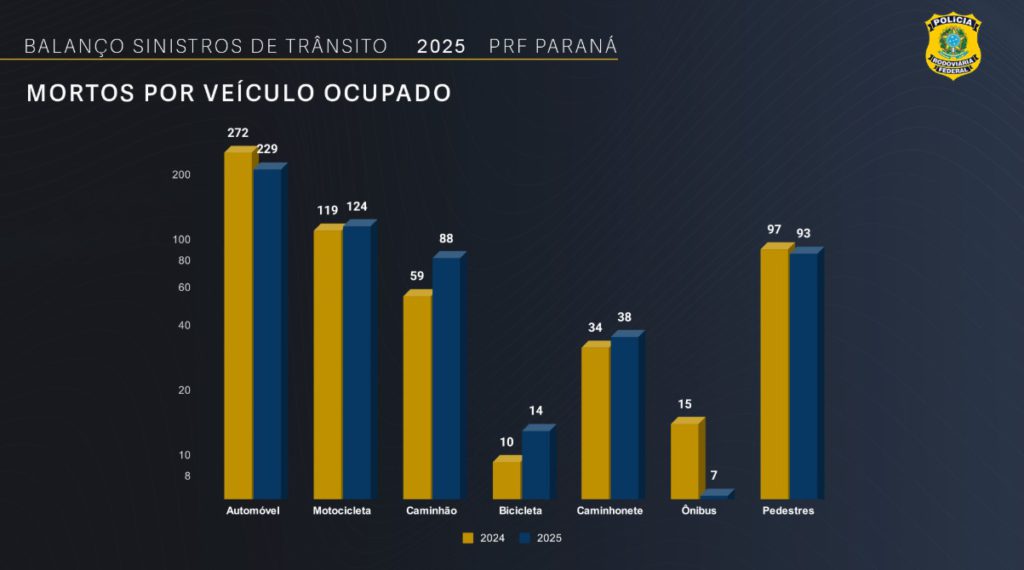A Polícia Rodoviária Federal (PRF) registrou, ao longo de 2025, 7.620 acidentes de trânsito nas rodovias federais que cortam o Paraná.