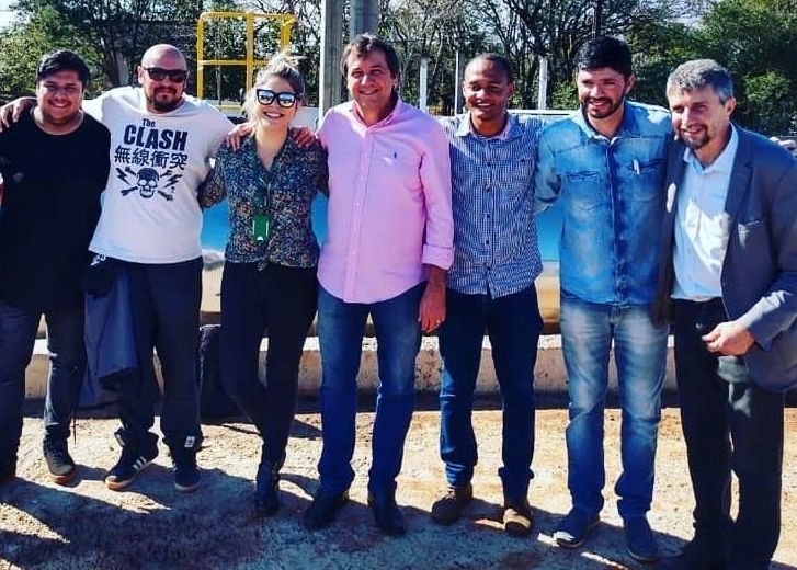 Da esquerda para a direita, Thiago (fotógrafo), Digão (agora de saída), Thays (jornalista), o prefeito Chico Brasileiro, Sérgio (jornalista) e Paulo (marketing). Não aparece na foto Douglas, o social media. Na ponta direita, o vice Nilton Bobato.