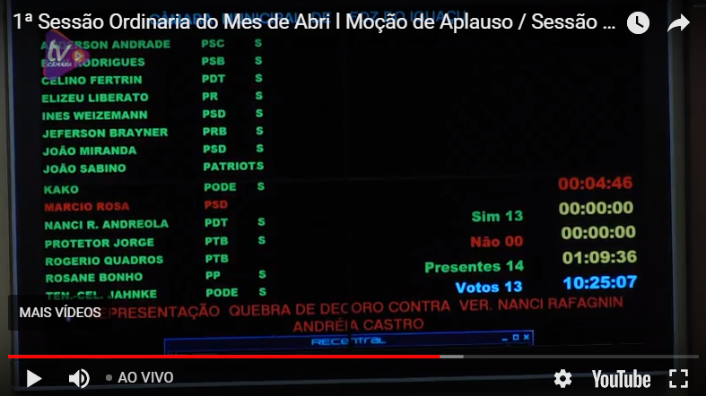 Prontamente, atendendo ou não ao pedido da vereadora, 13 parlamentares, inclusive Nanci, aprovaram o encaminhamento. Só faltaram os votos de Marcio Rosa, que se encontra enfermo, e do presidente do Legislativo, Rogério Quadros, que não precisou se manifestar.