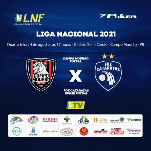 O Foz Cataratas Poker Futsal enfrenta o Campo Mourão Futsal na quarta-feira, 4 de agosto, às 17 horas, no Ginásio Belin Carolo, na cidade de Campo Mourão. A partida, válida pela 13ª rodada da Liga Nacional de Futsal, será realizada com portões fechados para o público, medida faz parte dos protocolos de proteção ao covid-19.