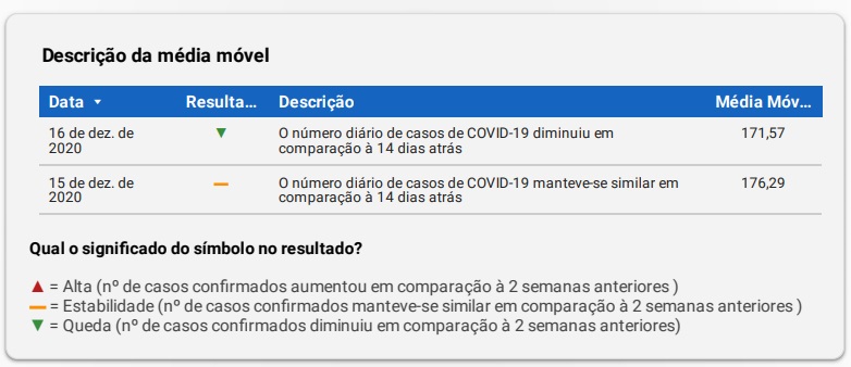 Em todo esse quadro, um dado positivo é o fato da média móvel de novos casos ter diminuído, em relação aos últimos 14 dias, veja no quadro abaixo.