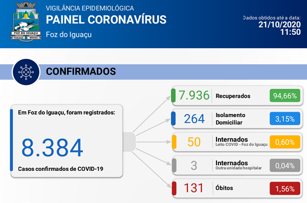A Vigilância Epidemiológica de Foz do Iguaçu confirma na data de hoje, 21/10/2020, 122 casos de COVID-19, totalizando 8.384 casos da doença no município.