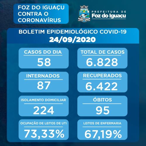 A Vigilância Epidemiológica de Foz do Iguaçu confirma na data de hoje, 24/09/2020, 58 casos de COVID-19, totalizando 6.828 casos da doença no município. Deste total, 6.422 pessoas já estão recuperadas.