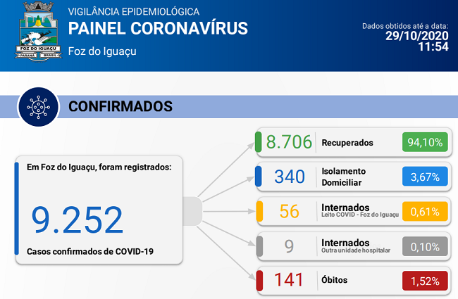 A Vigilância Epidemiológica de Foz do Iguaçu confirma na data de hoje, 29/10/2020, 112 casos de COVID-19, totalizando 9.252 casos da doença no município. Deste total, 8.706 pessoas já estão recuperadas.