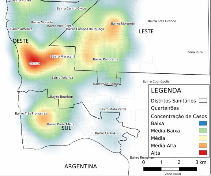Mapa de calor mostra que o centro da cidade tem a maior concentração dos casos de Covid-19