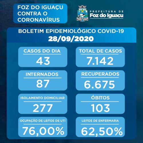 A Vigilância Epidemiológica de Foz do Iguaçu confirma na data de hoje, 28/09/2020, 43 casos de COVID-19, totalizando 7.142 casos da doença no município. Deste total, 6.675 pessoas já estão recuperadas.