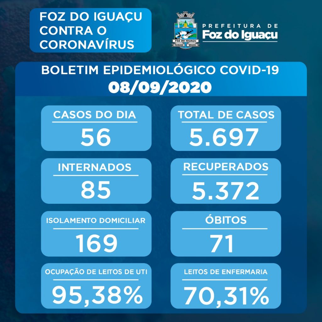 A Vigilância Epidemiológica de Foz do Iguaçu confirma na data de hoje, 08/09/2020, 56 casos de COVID-19, totalizando 5.697 casos da doença no município.