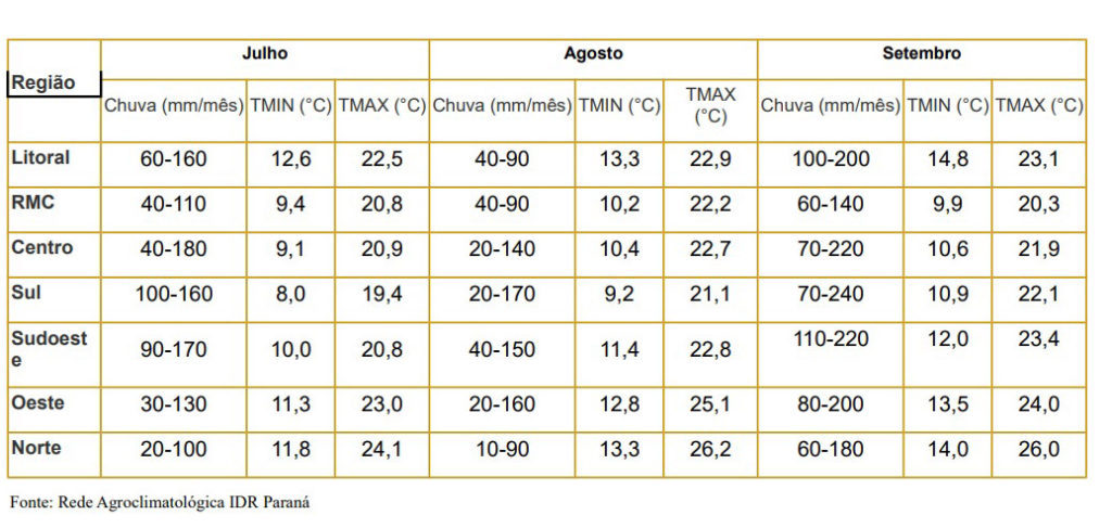 Traduzindo a tabela abaixo, para a região Oeste, onde está Foz do Iguaçu, o Simepar prevê: