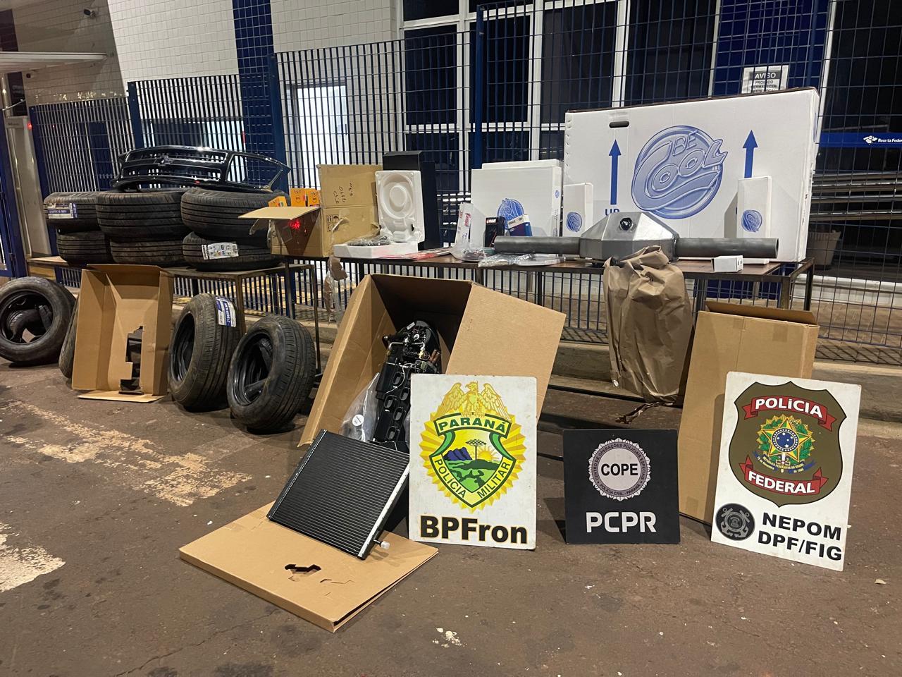 No local foram encontrados pneus, peças automotivas, cigarros e vapers trazidos do Paraguai