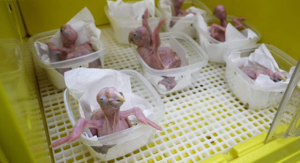 O Centro de Pesquisas de Vida Silvestre (CIASI), do Centro Ambiental Tekotopa da Itaipu, no Paraguai, passou a cuidar, nesta semana, de filhotes de araras-vermelhas (Ara chloropterus) e araras-azuis-grandes (Anodorhynchus hyacinthinus).