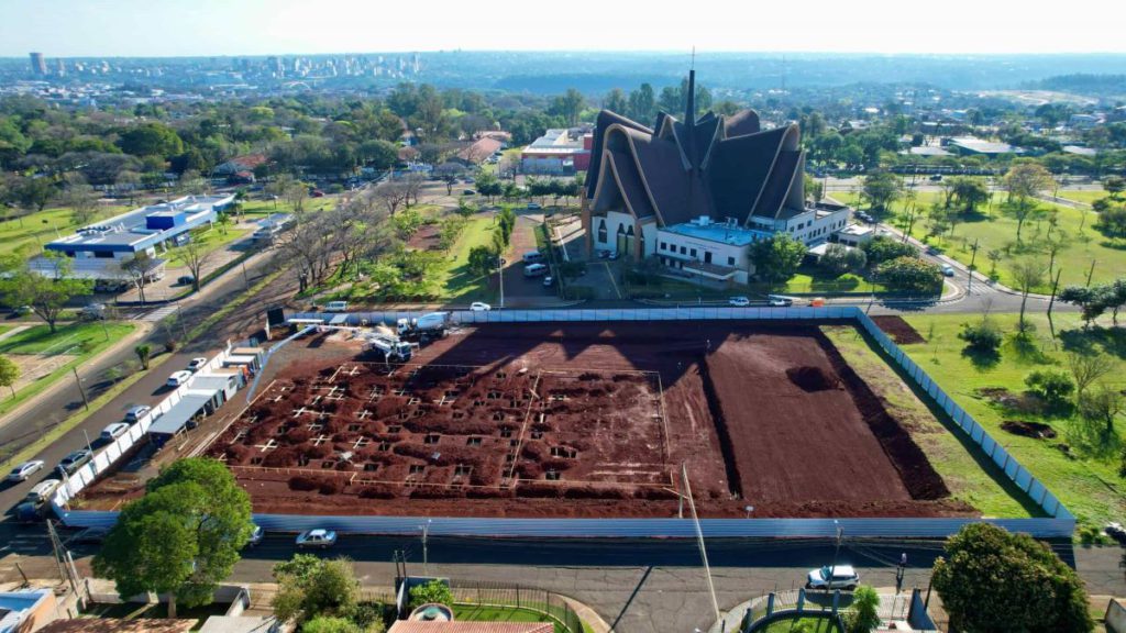 A construção está em andamento na Avenida Gramado, Vila A, ao lado da Catedral Nossa Senhora de Guadalupe. O investimento é de R$ 9,5 milhões da Itaipu Binacional, com execução do projeto sob responsabilidade do Itaipu Parquetec.