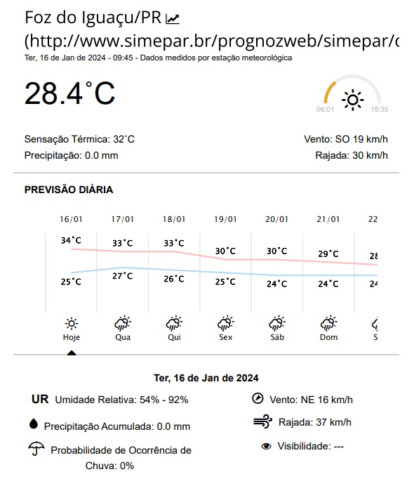 Ontem, a temperatura máxima em Foz foi de 29,1 graus, às 10 horas, segundo registrado pela estação meteorológica do Simepar em Foz do Iguaçu.
