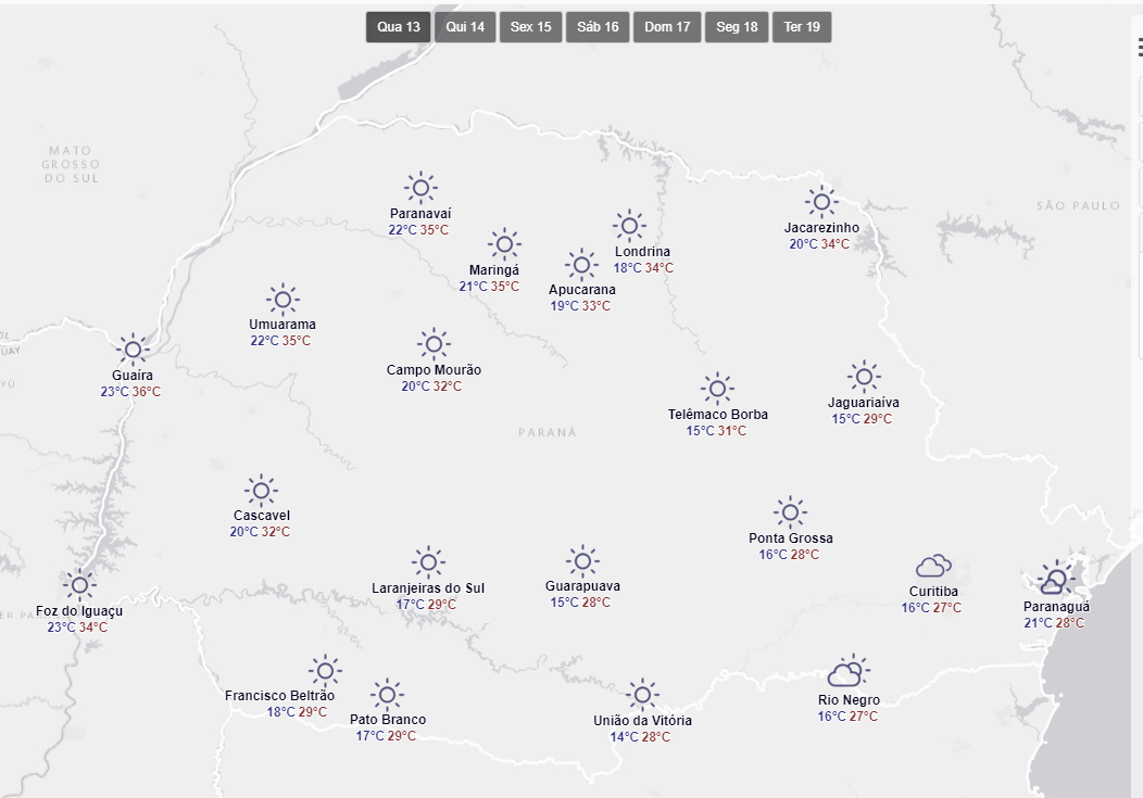 Segundo o Simepar, esta quarta-feira (13) será de temperaturas entre 23 e 34 graus e tempo seco: umidade do ar chega a 39%.
