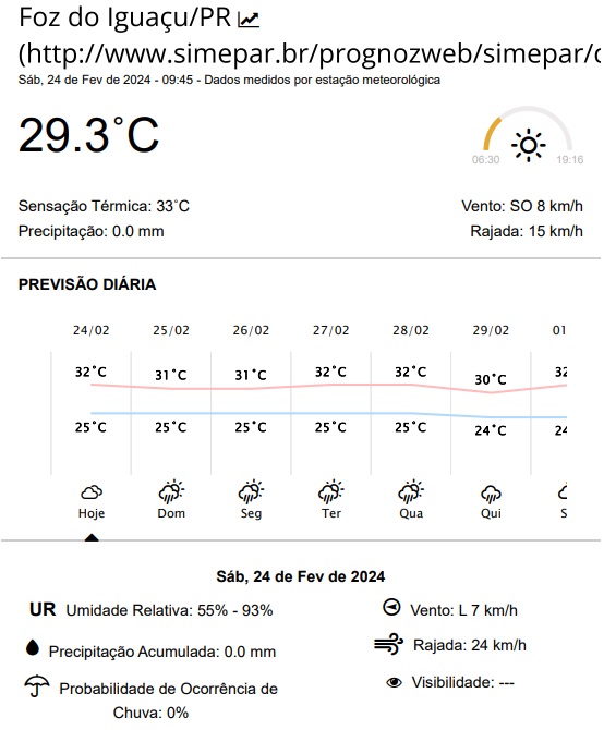 Sábado (24) com previsão de céu nublado em Foz do Iguaçu, segundo o Simepar. Temperaturas devem ficar na faixa dos 25 e 32 graus.