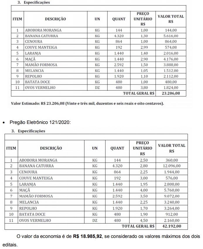 2-) então, a prefeitura resolveu abrir outro pregão, de número 121/2020, para comprar os mesmos alimentos, só que, desta vez, os valores praticamente duplicaram, passando (como mágica?) dos R$ 22,2 mil do pregão anterior para R$ 42.192,00.
