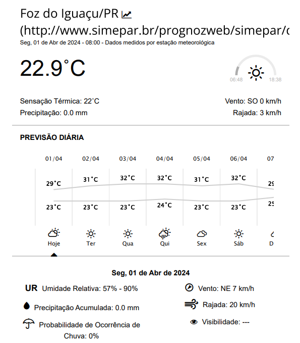 Segunda-feira com céu parcialmente nublado e quente: máxima de 29 graus. Vale lembrar que ontem, domingo, a máxima foi de 34 graus e a sensação térmica de 41 graus em Foz do Iguaçu.