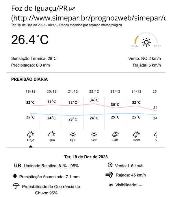 Terça-feira (19) com céu parcialmente encoberto em Foz do Iguaçu, com possibilidade de pancadas de chuva e rajadas de vento, típicas de verão. As temperaturas devem variar entre 25 e 32 graus.
