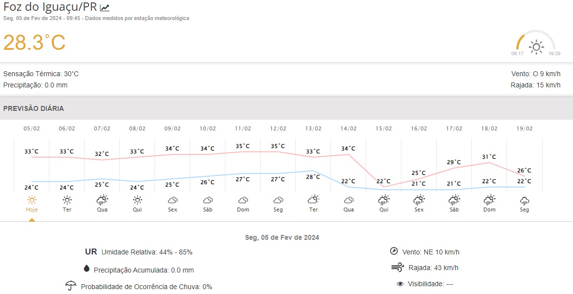 Segundo o Simepar, esse calorão só deve ir embora logo depois do Carnaval, no dia 14 de fevereiro, após vários dias com céu nublado, depois, a temperatura despenca para 22 graus, conforme mostra a tabela abaixo.