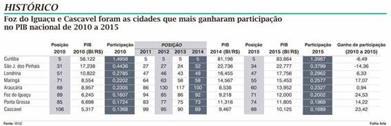 Nos últimos dias, o tema voltou à tona, depois que o IBGE publicou os dados do PIB 2015. Diversos veículos da imprensa iguaçuense repercutiram a notícia, basicamente replicando as palavras de nota liberada pela Agência de Notícias da Prefeitura Municipal de Foz do Iguaçu ou apresentando planilha elaborada pela Folha de Londrina, apresentando manchetes positivas, mas sem fazer a devida análise, e em clima de comemoração pelo “bom resultado de Foz”.