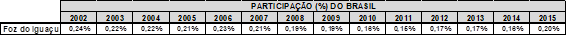 E como 2010 foi praticamente o ponto mais baixo desse gráfico de Foz (0,16%), praticamente qualquer outro ano comparado com ele representaria em crescimento. Se compararmos os números de 2015 com outros anos anteriores (antes de 2009), estaríamos falando de estagnação ou redução da participação, e não o contrário. Em 2015, nossa participação ficou em 0,20%, mas entre 2002 e 2007 oscilou entre 0,24% e 0,21% (o que representa uma redução de quase 20%).
