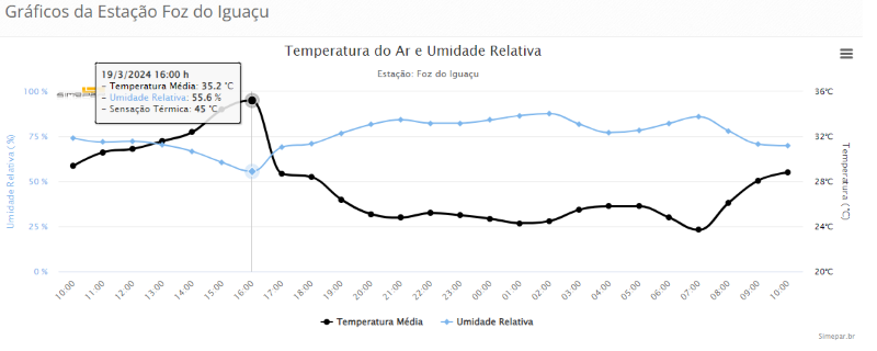 Ontem (19), último dia do verão, a população de Foz do Iguaçu sofreu um choque térmico natural, com uma queda abrupta de temperatura de 35,2 graus, e sensação térmica de 45 graus, registrada às 16 horas, para 28,7 graus, e sensação térmica de 32 graus, às 17 horas.