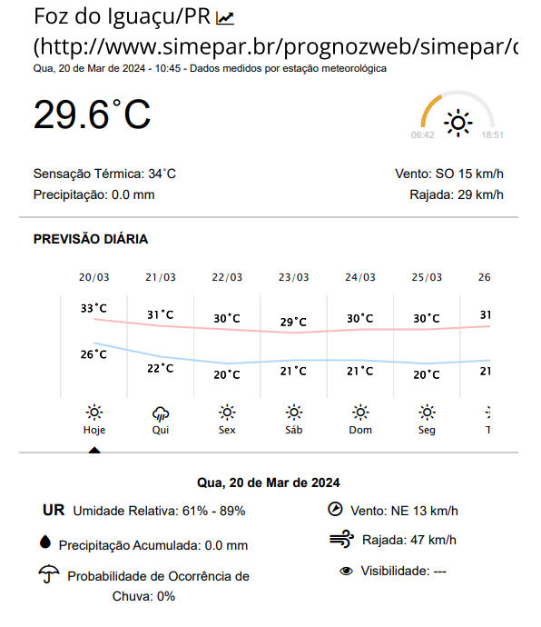 Já esta quarta-feira (20), primeiro dia do outono em Foz do Iguaçu, deverá ser bem quente, com temperaturas variando entre 33 e 26 graus, além de tempo úmido, o que deverá elevar a sensação térmica.