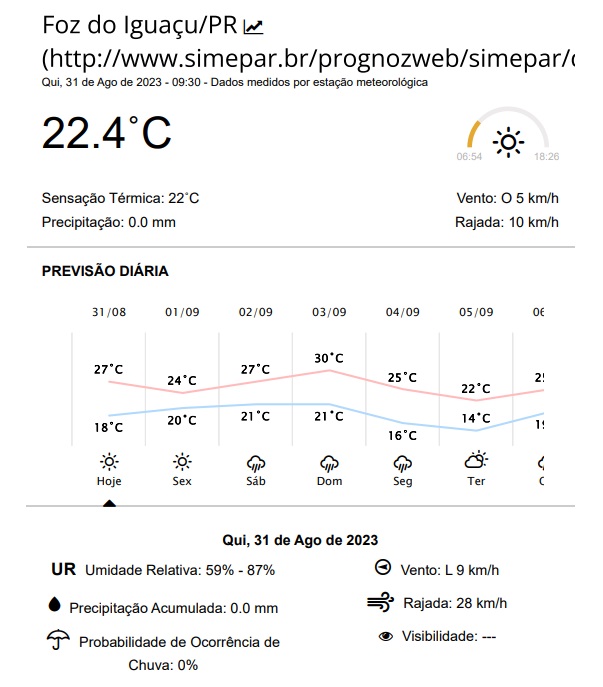 Quinta-feira, 31 de agosto, data em que se comemora o Dia do Nutricionista e o Dia do Outdoor, será ensolarada em Foz do Iguaçu, com máxima de 27 graus.
