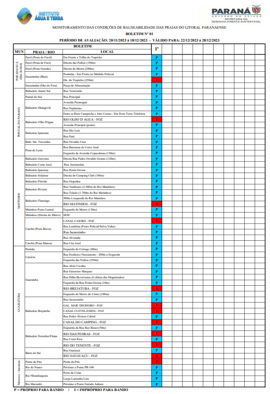 O primeiro boletim de balneabilidade da temporada de verão 2023/2024, divulgado nesta sexta-feira (22) pelo Instituto Água e Terra (IAT), mostra que a população pode aproveitar as praias do Litoral e, também, as prainhas de água doce das costas Oeste e Noroeste.