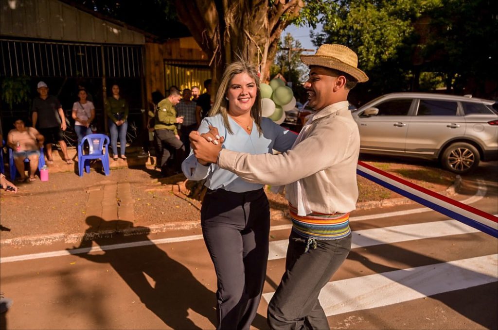 A prefeita interina de Ciudad del Este, Maria Portilho, comemorou o asfaltamento nas vias da cidade dançando com um morador do local.