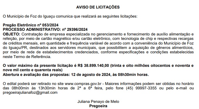 A disputa milionária, no valor de até R$ 38,9 milhões, se destina à contratação de empresa para gerenciar e fornecer alimentação e refeições aos servidores municipais de Foz do Iguaçu, por meio de cartão magnético.