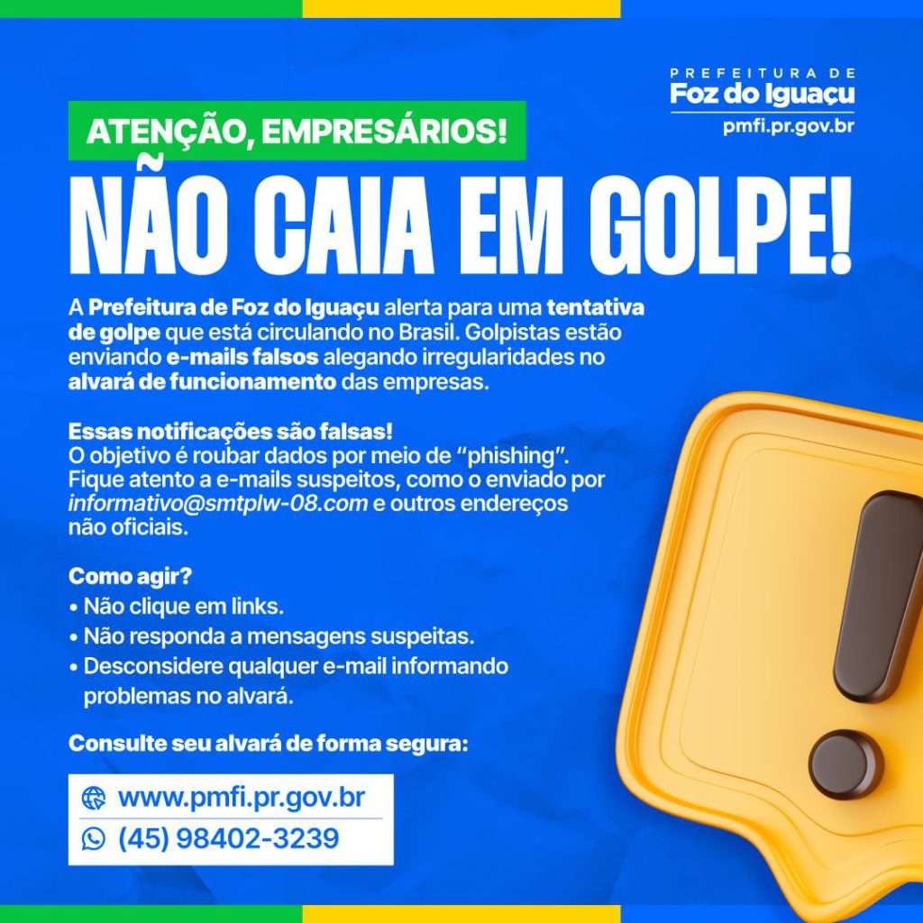 A Prefeitura de Foz do Iguaçu alerta os empresários sobre uma tentativa de golpe que está sendo registrada em todo o Brasil. Golpistas estão enviando e-mails fraudulentos, informando que um suposto “Departamento de Licenciamento Urbano e Obras” encontrou irregularidades no alvará de funcionamento das empresas.