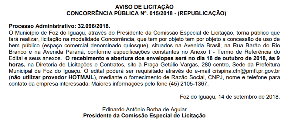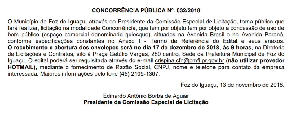 A Prefeitura de Foz do Iguaçu publicou na edição de ontem(13) do Diário Oficial do Município a abertura de concorrência pública para a exploração comercial dos quiosques das Avenidas Brasil e Paraná. No dia 14 de setembro, a prefeitura publicou um edital com a mesma finalidade.