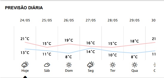 A novidade fica por conta do domingo, que deve ser ensolarado, mas com frio, também: mínima de 8 graus.