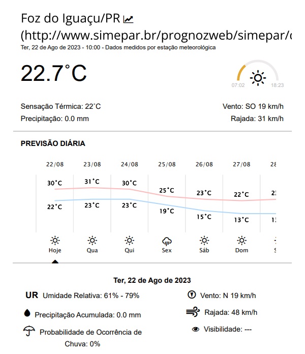 Terça-feira (22), Dia do Folclore e Dia do Supervisor Escolar, ensolarada em Foz do Iguaçu, com máxima de 30 graus.