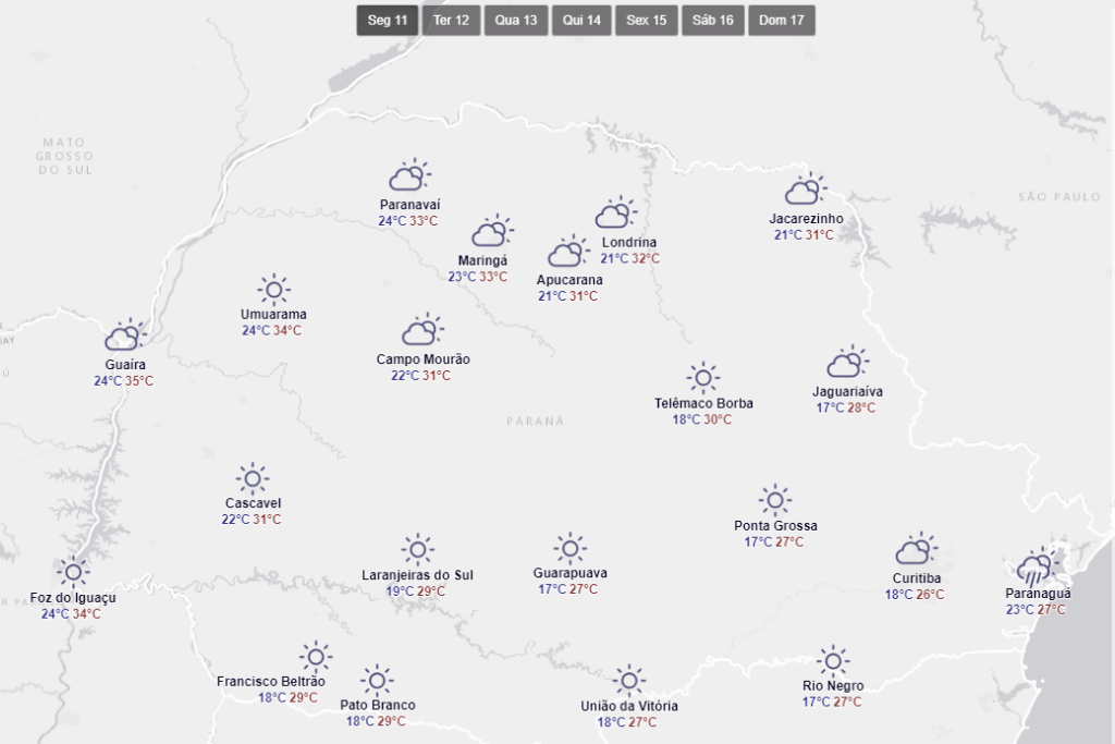 Panorama do tempo no Paraná, segundo o Simepar.