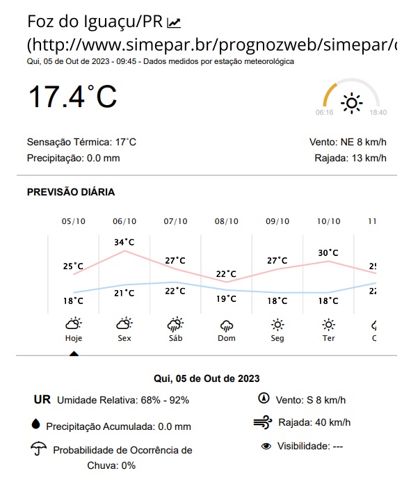 Quinta-feira (05) com sol entre nuvens em Foz do Iguaçu. Máxima de 25 graus, sem previsão de chuva.