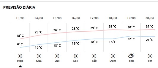 Porém, por enquanto, está se confirmando uma onda de calor até o fim desta semana, com temperaturas máximas de até 31 graus e mínima de 18 graus no domingo, 18 de agosto.