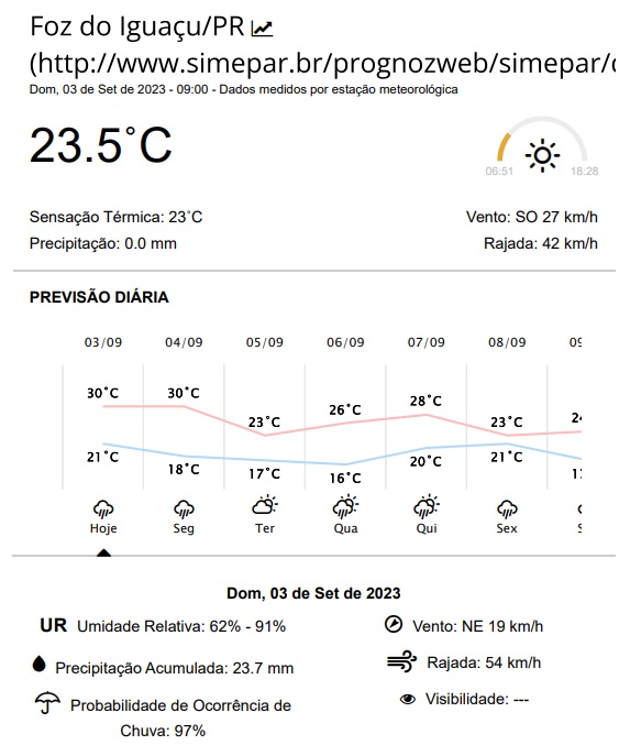 Domingo (03) chuvoso em Foz do Iguaçu, mas com o aparecimento do sol entre nuvens, e máxima de 30 graus.