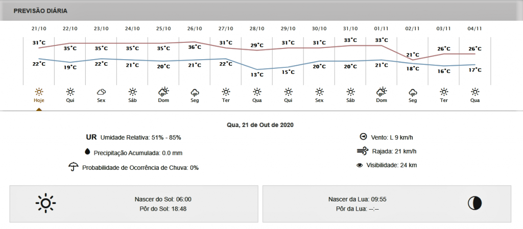 Nesta semana, até o dia 26 de outubro, a previsão continua de muito calor, com chuva no domingo e na segunda.